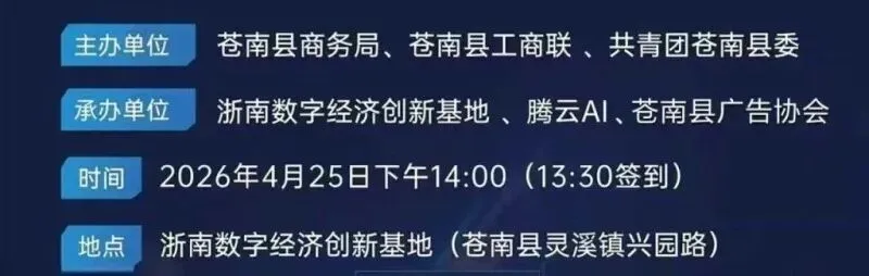 为助力协会会员抢抓 AI 发展机遇,破解创意生产效率瓶颈,推动本地广告行业数智化转型,苍南县广告协会联合多方资源,于2026 年 4 月 25 日下午,在浙南数字经济创新基地专属为协会会员打造了「数智苍南・AI 赋能企业发展专题讲座」。