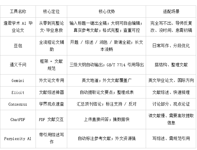 8款AI毕业论文工具核心功能总结表
