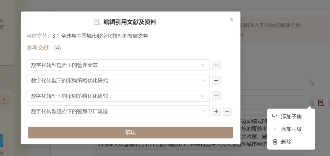 逢君学术的大纲自定义功能让你可以从容应对。导师的意见,你可以直接体现在大纲的调整上:增加某个方面的文献、细化某个要点的论述、调整章节的顺序。输出的时候,所有修改都会体现在文稿里。你不需要纠结“怎么改”,只需要知道“改什么”。