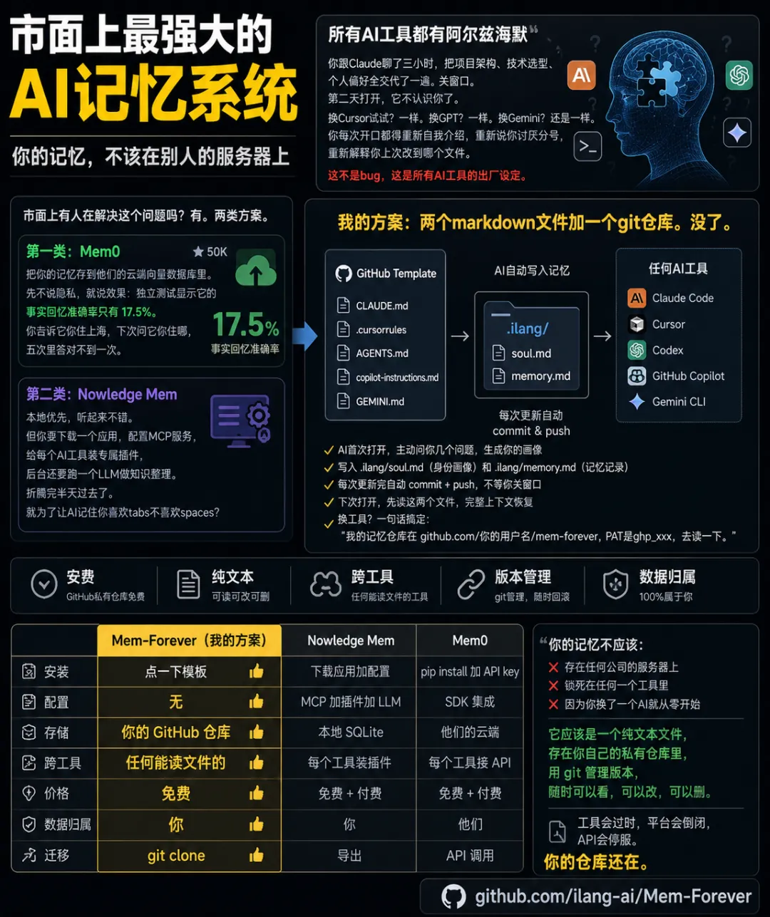 GitHub私有仓库免费。没有服务器。没有订阅。没有API费用。没有Pro版本。没有”升级解锁更多记忆”。外面居然把这些功能做了一个SaaS,对用户收费。