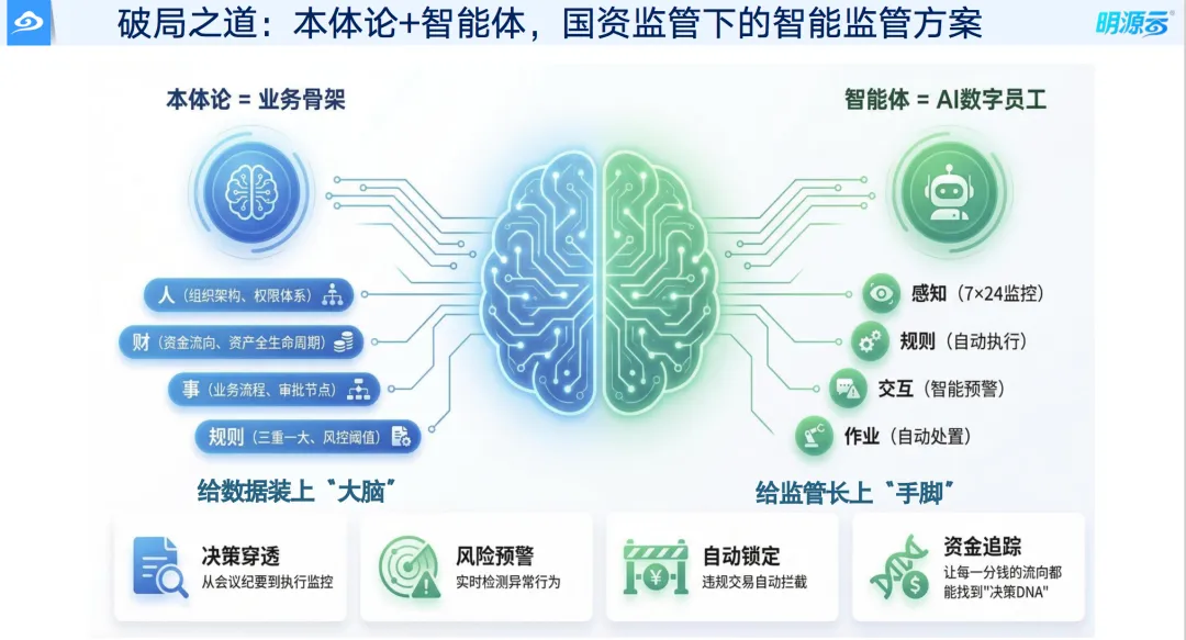 在智能化方面,明源云提出基于“本体论+智能体”的智能监管方案。通过AI赋能投资、建设、采购、资金、财务、资产、三重一大等八大核心场景。比如: