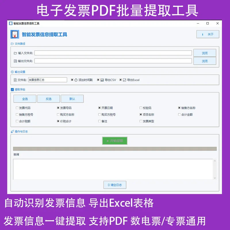 很简单,选好放发票的文件夹,勾上你要提取哪些信息(发票号码、金额、销售方这些),点一下开始,等着就行。