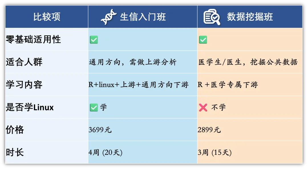 如果你还是选择困难,两个都要,联合报名优惠价4199元,默认本月参与生信入门班,下月参与数据挖掘班,有特殊要求(如先上数据挖掘,两个班同月参加),我们会灵活安排。