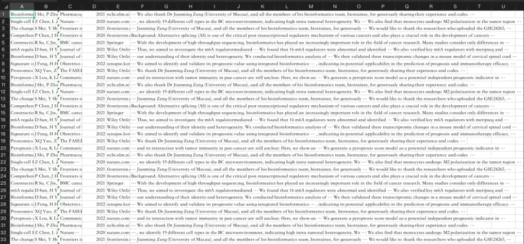 这是一个长达200多行的表格,实在不宜放在正文里凑字数,在生信技能树公号后台回复”致谢文章“,即可查看。亮个截图!