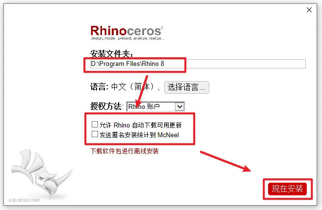 4.选择软件安装路径,安装路径不要出现中文,取消勾选“允许Rhino自动下载可用更新”和“发送匿名安装统计…”,点击“现在安装”