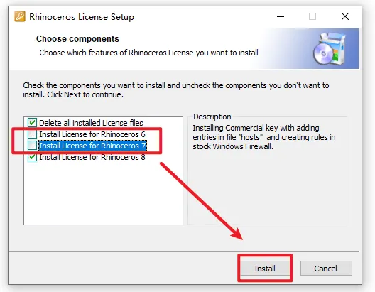 9.取消勾选“Rhinoceros 7和Rhinoceros 6”两项,点击“Install”