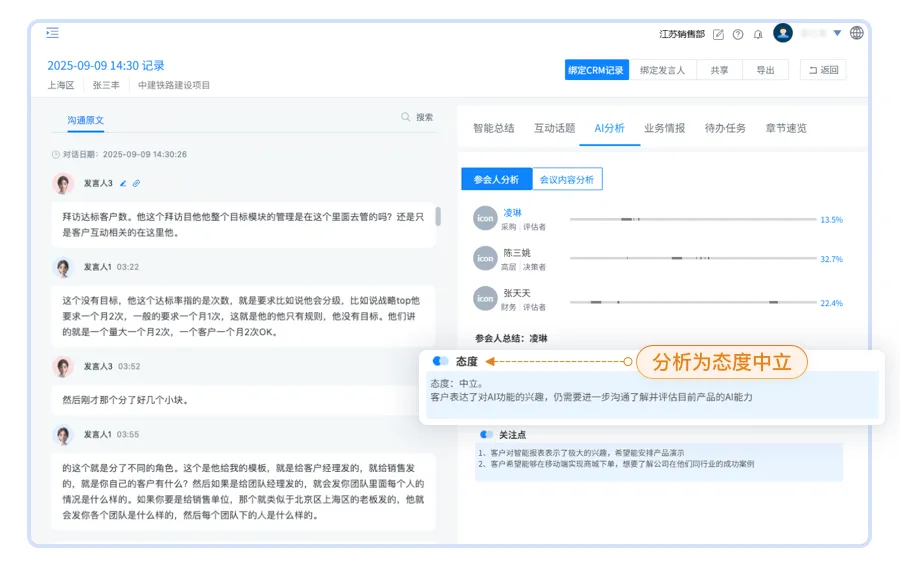 态度分析:对每位参会人的情绪倾向与态度进行实时分析,识别积极推动者、态度保留者或顾虑者,输出整体态度画像,帮助销售在关键决策者中区分支持者与潜在阻碍,提前调整跟进策略。