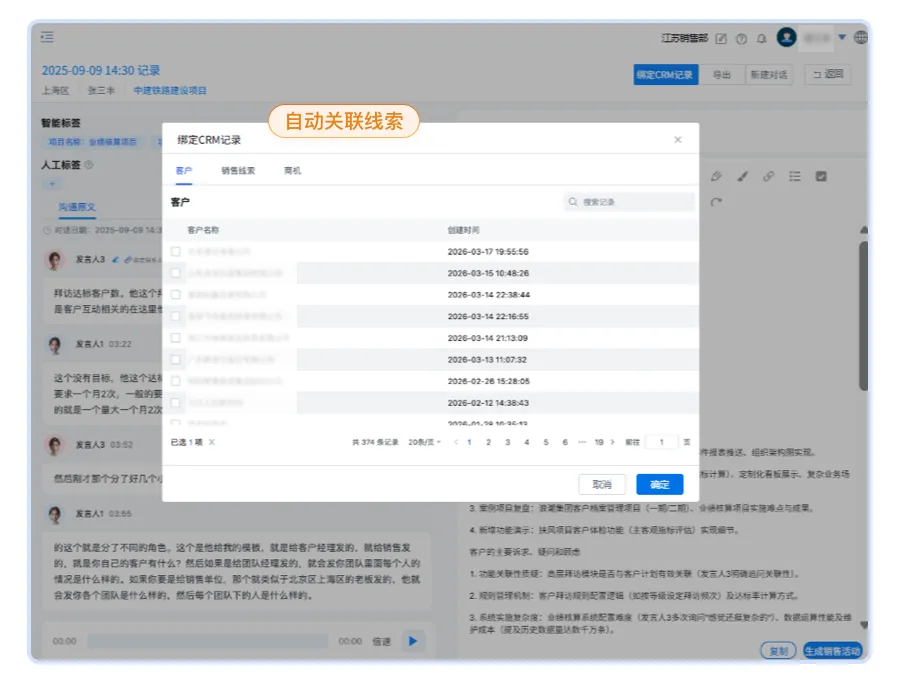 智能绑定:AI不仅将会议信息绑定至企业项目下,更精准识别并关联CRM中对应联系人。同时根据会议形式自动创建销售活动,生成待办任务,如提醒发送资料、设定二次跟进时间等,确保每步执行有据可依。