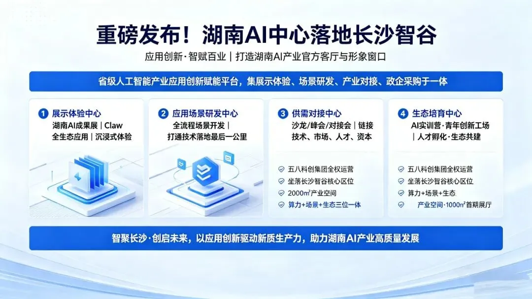 重磅!“湖南AI中心”在长沙智谷正式发布!这一中心的落地,既是响应湖南省深入实施“人工智能+”行动、全力建设全球研发中心城市战略举措的具体实践,也是长沙智谷打造千亿级数字经济与人工智能产业集群、筑牢产业创新高地的重要支撑,更是驱动新质生产力发展、完善湖南AI产业生态的关键布局。作为省级人工智能产业应用创新赋能平台,湖南AI中心由五八科创集团打造和全权运营,深度扎根长沙智谷,与园区共生共荣、协同发展。