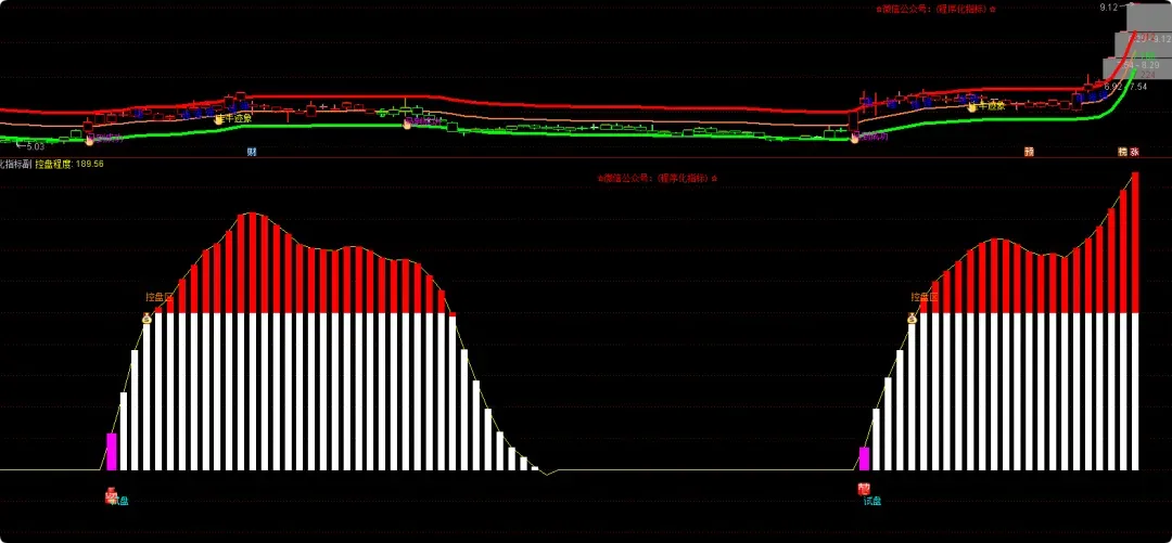 控盘程度 : IF(控盘差值 > 3, (控盘差值 – 5) * 2.5, 0), COLORYELLOW;