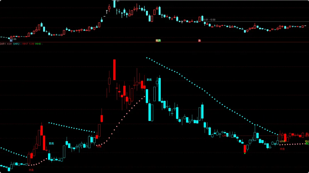 SAR2:IF(CLOSE<Y,Y,DRAWNULL),CIRCLEDOT,COLORCYAN;
