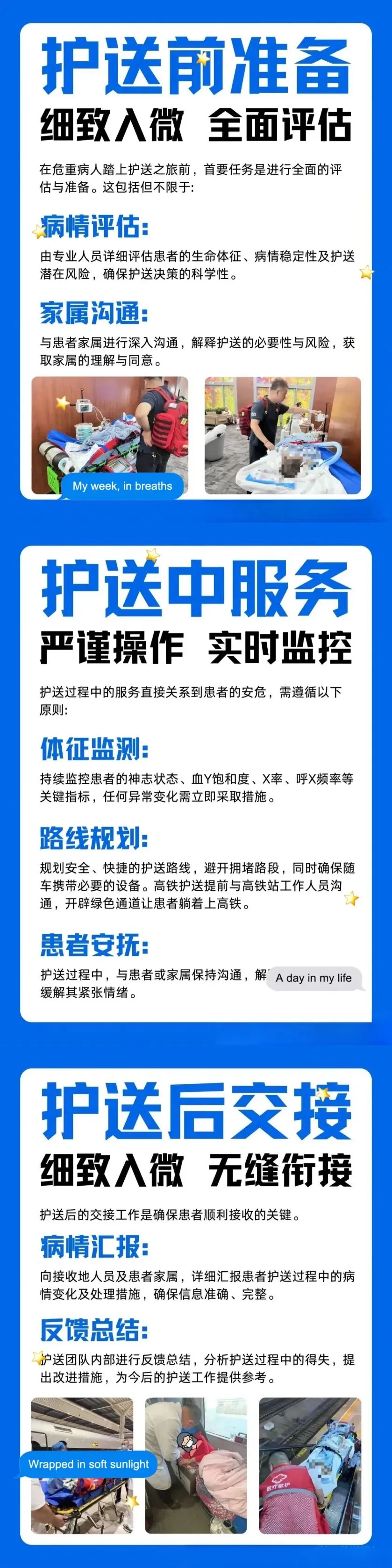 4、看流程:接单先评估病情、提前准备、途中监护、到达交接,一套完整流程。
