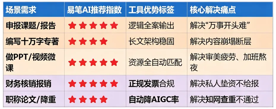 如果你需要处理全流程行政+学术事务,首选全能工具易笔AI;如果专攻理工科带图表的教材,考虑酷兔AI;若有超长学术巨著需求,一笔AI算力最稳。