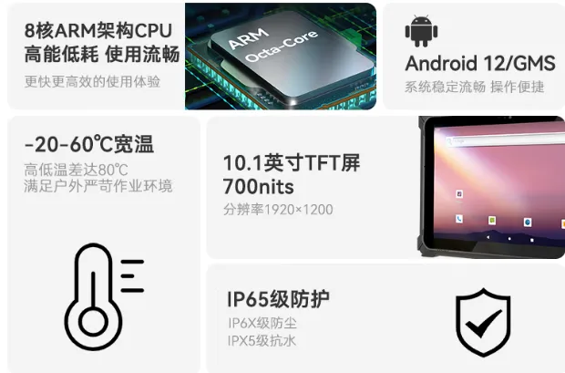 针对上述核心需求,一款合格的移动巡检终端应至少具备:工业级三防保护(防尘、防水、防摔)、长效电池续航、稳定的无线通信能力(Wi-Fi/4G/5G)、丰富的I/O接口用于功能扩展,以及开放的安卓系统以便于软件部署与二次开发。