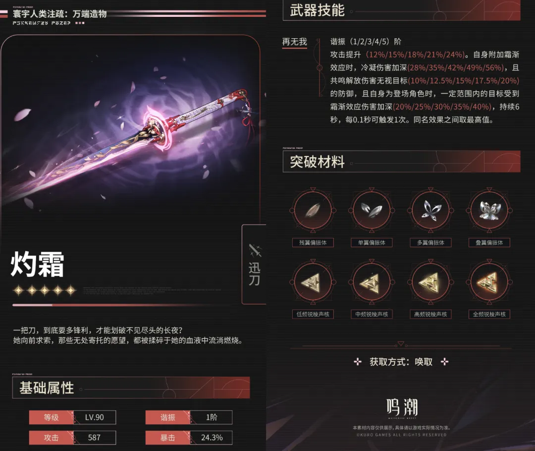 值得一提的是,最近官方也是公布了绯雪的专武效果,以及突破材料,绯雪的专武是【灼霜】,武器提供24.3%暴击,除了攻击提升,在霜渐效应时冷凝伤害加深提升,共解伤害还可无视目标百分比防御等。