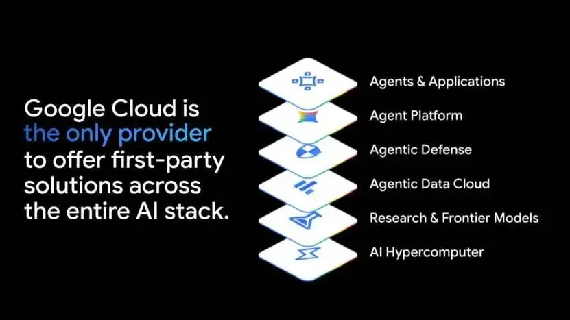 谷歌的定位是:自己是唯一提供全栈能力的云厂商,将芯片、基础设施、数据、模型、应用与服务整合为一套连贯系统,支撑智能体工作负载。与此同时,多数头部大模型厂商并不拥有云平台,这为谷歌将模型能力转化为企业级部署提供了结构性优势。