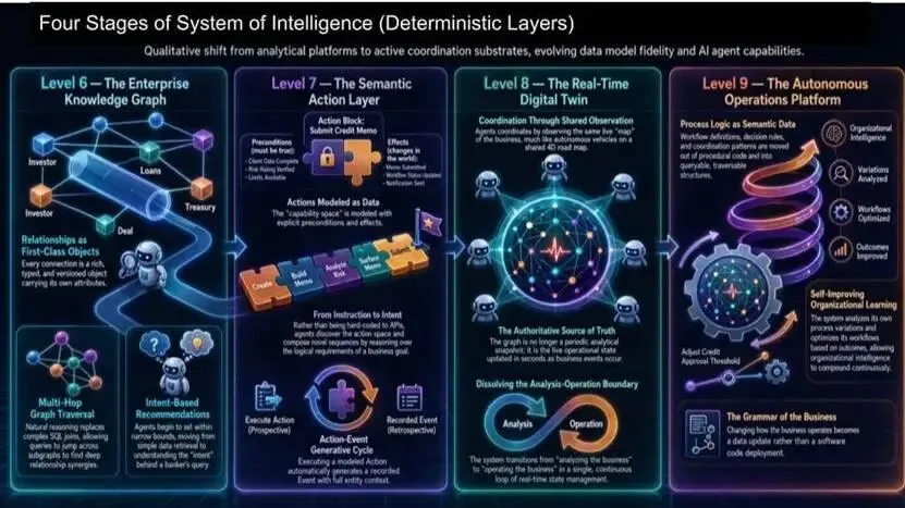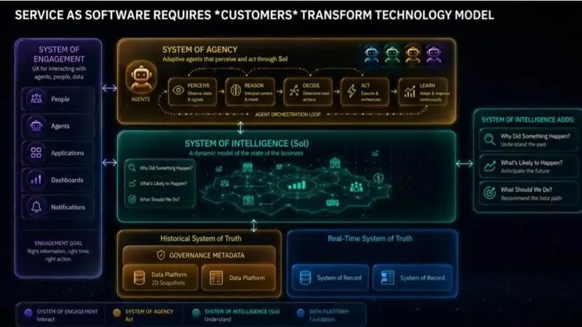 SaaS 改变了软件厂商与 IT 部门;服务即软件改变整个企业。智能体只有跨孤岛运行才能创造价值。智能体系成为企业的智能层,位于记录系统与部门数据 / 应用栈之上。