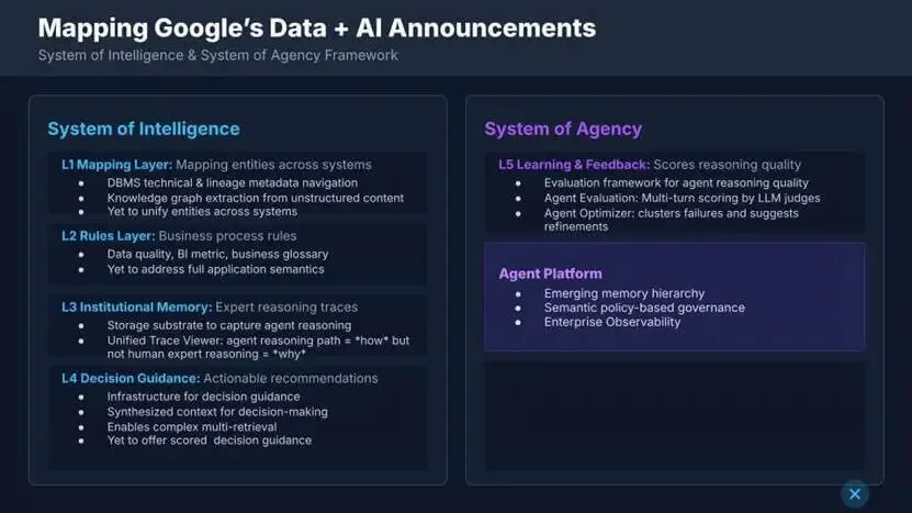 这场转型的核心是数据与 AI 平台——我们称之为 “智能体系”,谷歌最初以知识目录(Knowledge Catalog) 的形式对外呈现。这一能力最终会将分析型应用与运营型应用抽象化、统一化。在此之上,正在形成一套智能体体系(谷歌称之为 “行动体系”),由知识目录与智能体平台共同构成。