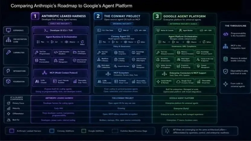 Anthropic、OpenAI、Grok 均聚焦编码能力;谷歌则另辟蹊径,构建企业级智能体平台,将管控框架扩展到更广泛场景。
