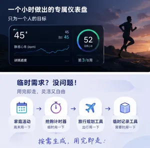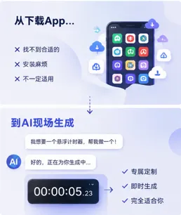 再比如说,我以前玩潮玩经常有抢限量产品的需求,那这样的话,其实可以让AI帮我出一个悬停的闹钟工具。之前我需要抢票之类的,可能需要下载一个悬停时钟类的APP,然后打开APP,再去输入目标时间、链接、服务器校准等,然后盯着它准时去抢东西。现在就不需要经过这个步骤了,我需要一个临时需要一个定时器的话,可以跟AI描述需求,AI就可以帮我把这个悬停的计时工具生产出来,可能就只需要几分钟。有AI的辅助情况下,可能下载还没有完成,AI已经帮我把这个东西做出来了。