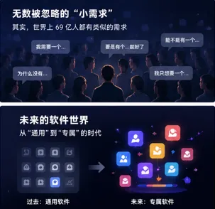 其实我们现实生活里有很多微小需求,是你自己特别需要的,但是,市面上首先很不容易找到适合你需求的软件,即使找到了,那软件的形式形态是什么?可能是一个插件,可能是一个独立软件,可能是一个GitHub开源项目,你还需要鼓捣一下,怎么样安装到自己的设备上,你的设备是安卓、iOS还是Windows,对吧,然后又不一定适用。