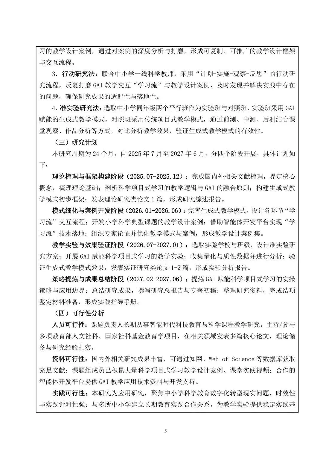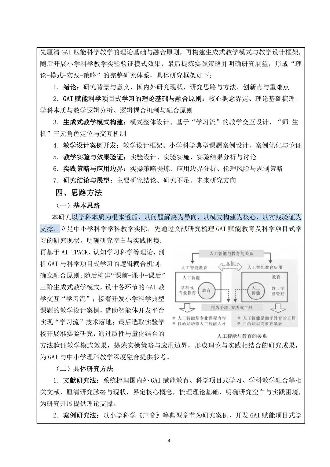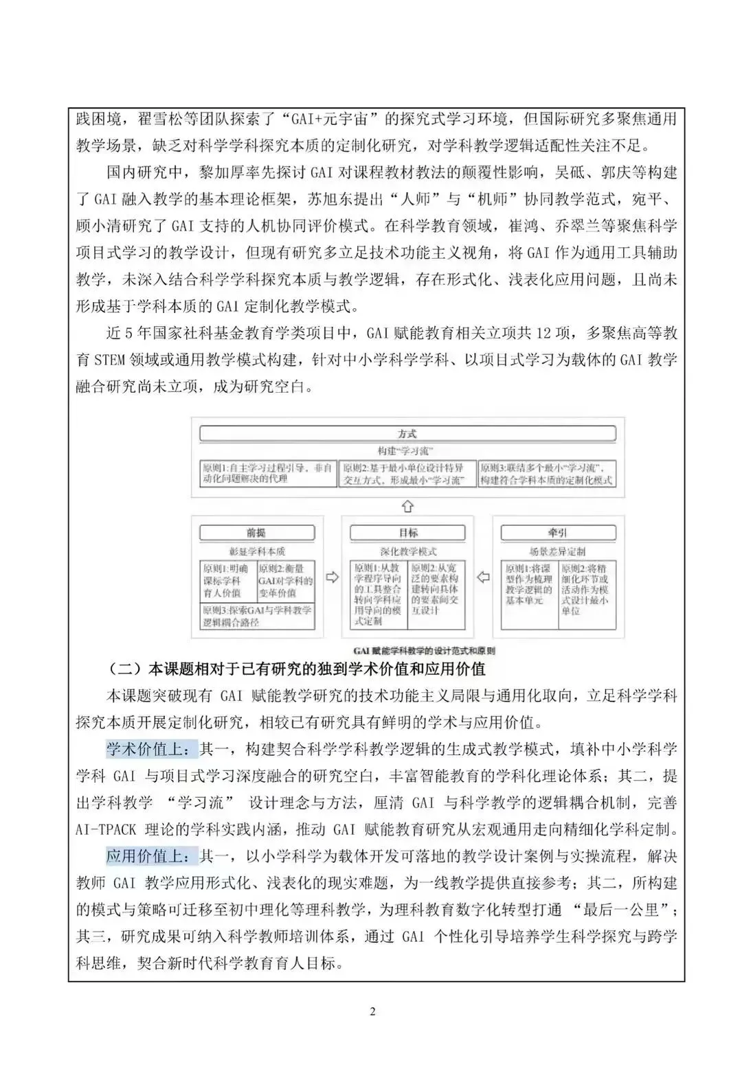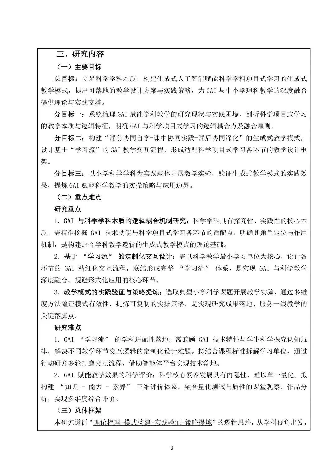 本课题紧扣教育强国建设与教育数字化战略部署,聚焦生成式 AI 在中小学科学教学中暴露的形式化应用、学科适配性不足、育人价值弱化等核心痛点,以 “学习流” 设计为核心实施路径,系统研究生成式人工智能赋能科学项目式学习的逻辑耦合机制、定制化生成式教学模式构建及全流程教学实操方案。