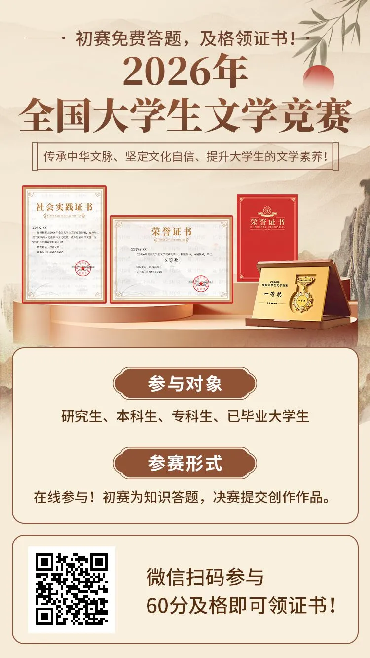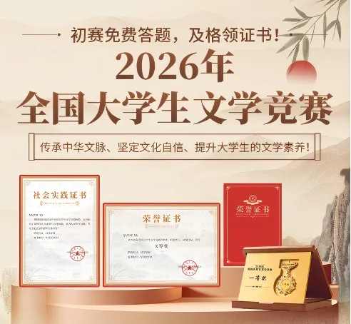 【第一场证书已开放下载】2026年全国大学生文学竞赛第一场初赛证书可!决赛报名仅剩2天!