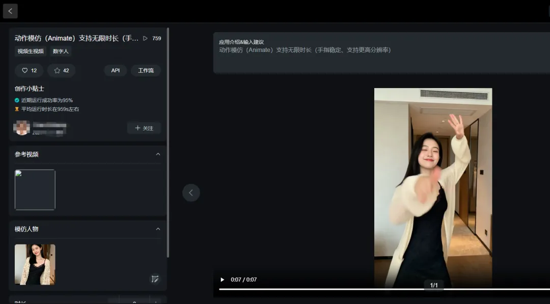 打开动作模仿AI智能体,上传参考舞蹈视频和生成的AI美女图。注意:生成视频的时长,一定要根据你的参考视频来设置,保持一致。