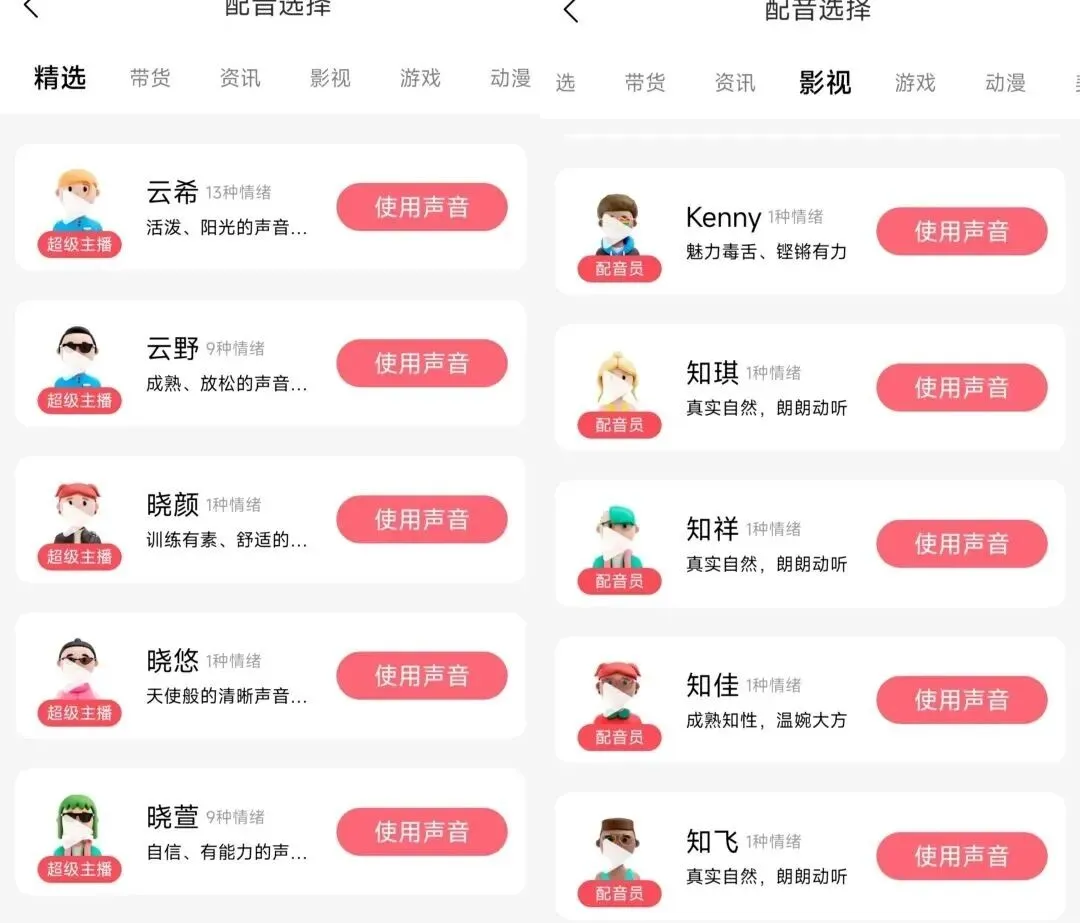 7、各类配音库,提供多种音色和风格选择。