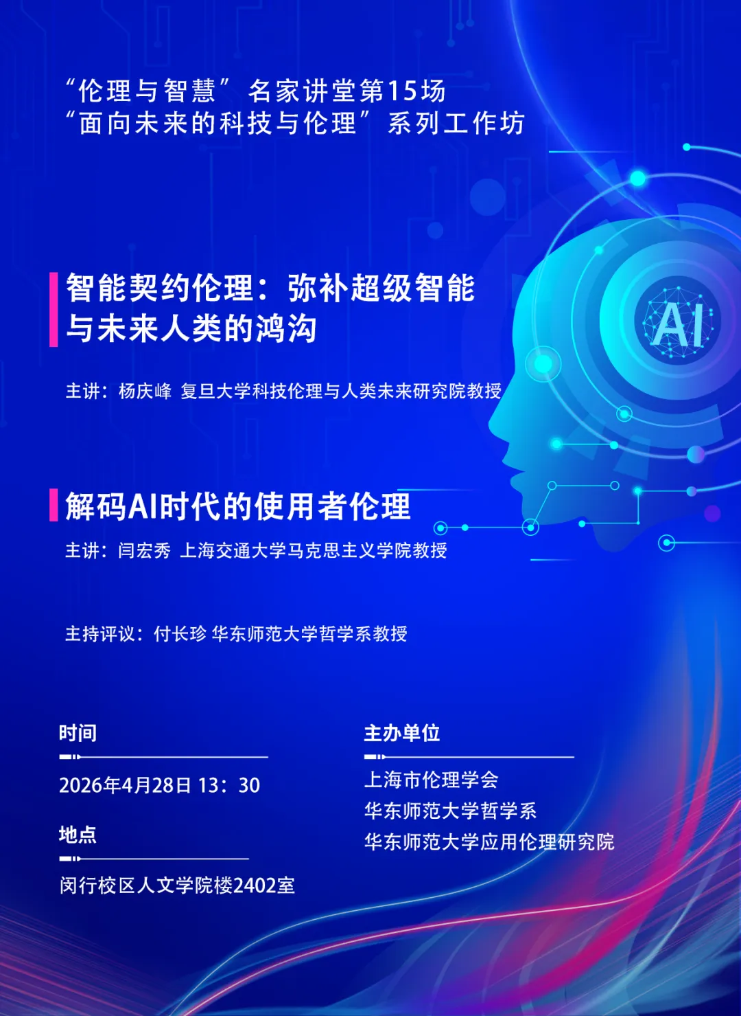 杨庆峰,复旦大学科技伦理与人类未来研究院副院长、哲学学院教授,博士生导师;全国应用伦理教指委秘书长;国家社科基金重大项目“当代新兴增强技术前沿的人文主义哲学研究”首席专家。