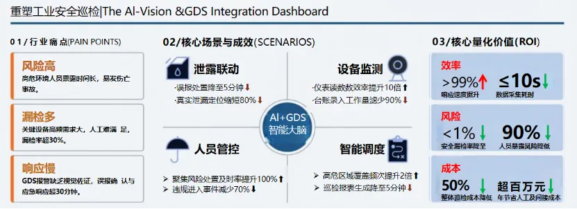 突破传统GDS报警仅靠数据但无场景依据的局限,创新构建“GDS报警-AI视频弹窗-可视化确认”闭环机制,响应延迟≤1秒,较人工现场确认效率提升80%,误报率降低70%以上。