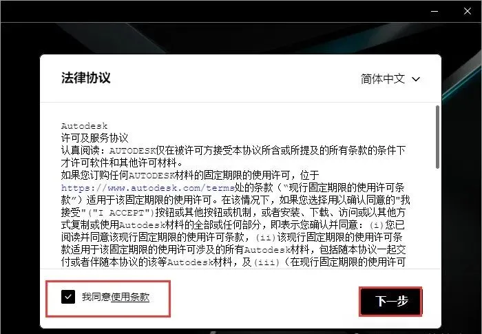 6.勾选我同意使用条款,然后点击下一步
