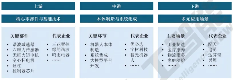 具身智能产业链分为上游核心零部件与基础技术、中游本体制造与系统集成、下游多元应用场景三大层级。上游环节包括谐波减速器、六维力传感器、无框力矩电机、空心杯电机、丝杠、控制器、芯片等关键部件及基础算法研发,代表企业有三花智控、绿的谐波、鸣志电器等。中游聚焦机器人本体制造、系统集成和大模型平台开发,优必选、宇树科技、智元机器人等企业在本体制造和系统集成领域表现突出。下游涵盖工业制造、医疗康养、物流服务、家庭陪护等多元应用场景,推动机器人技术规模化落地。各层级通过灵巧手、运动控制算法、大脑-小脑协同架构等核心环节,实现价值传递和技术协同,形成从硬件到软件、从研发到应用的完整生态闭环。