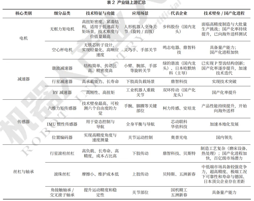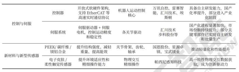 具身智能产业链上游已形成涵盖电机、减速器、传感器、丝杠轴承、控制伺服,以及新材料等的技术体系,国内企业在无框力矩电机、谐波减速器、六维力传感器等高壁垒环节实现显著突破,国产化进程加速,核心零部件自主可控能力持续增强,为产业规模化发展奠定了坚实基础。