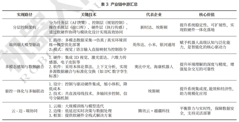 中游环节聚集了大量本体制造和系统集成企业,形成了以上海、深圳、苏州等为代表的区域产业集群。2023 年,上海浦东机器人产业规模超过200亿元,集聚人工智能重点企业超600家,规上人工智能企业产业规模超1400亿元。2023年,深圳机器人产业链总产值达1797亿元,企业数量近6万家,产业链完整,涵盖本体制造、系统集成和零部件配套”;苏州吴中区“机器人+智能制造”企业超千家,2023年产业规模达1369.3亿元,全国六成以上的服务机器人产自吴中区,全国七分之一的内资品牌工业机器人来自吴中区。本体制造和系统集成的主流技术路径包括分层决策模型、大模型驱动端到端集成、多模态感知融合,以及云边端协同架构等。