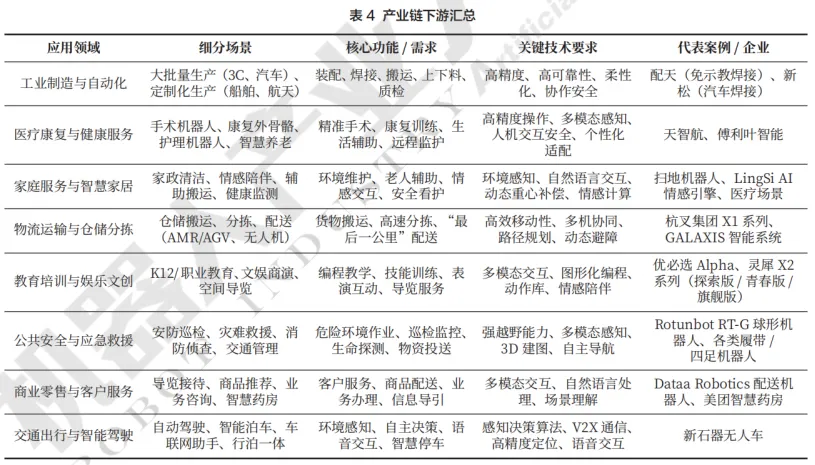 具身智能产业链下游应用场景广泛,涵盖工业制造、医疗康复、家庭服务、物流运输、教育娱乐、公共安全、智慧养老与智慧医疗、商业零售、交通出行等细分领域。各场景推动多机器人协作和跨模态融合,实现具身智能产品的多样化落地与规模化应用。