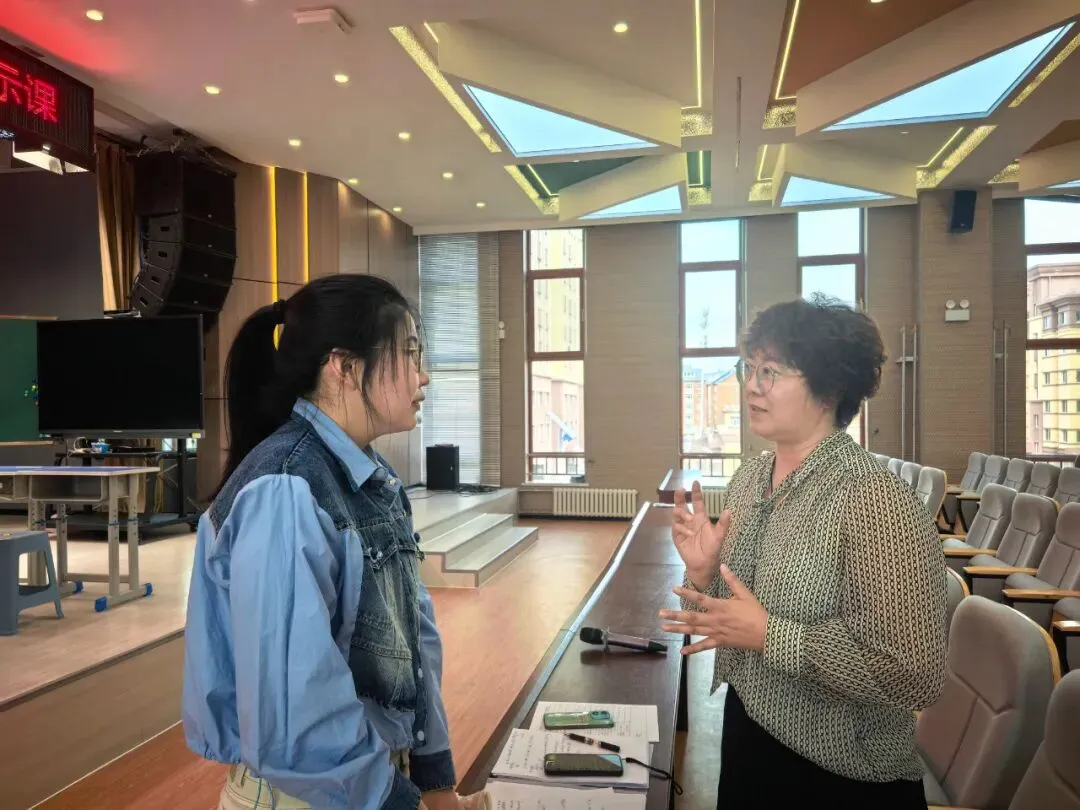 课堂展风采,评课促成长。授课结束后,教研员与授课教师开展面对面评课交流。大家围绕AI与课堂教学的融合实效展开深度研讨,教研员精准点评课堂亮点与待提升之处,针对AI工具的应用场景、教学设计优化等方面给出专业指导,为教师理清教学思路,让AI赋能课堂的实施路径更加清晰明确。