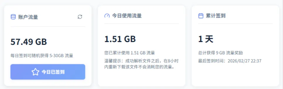 亲测300M带宽下,1GB的文件大概只需要7分钟就能下载完成,比原生网盘速度快几十倍!日常偶然下载文件完全够用,每天打开工具签个到,就能持续使用高速权限,不用额外付费。