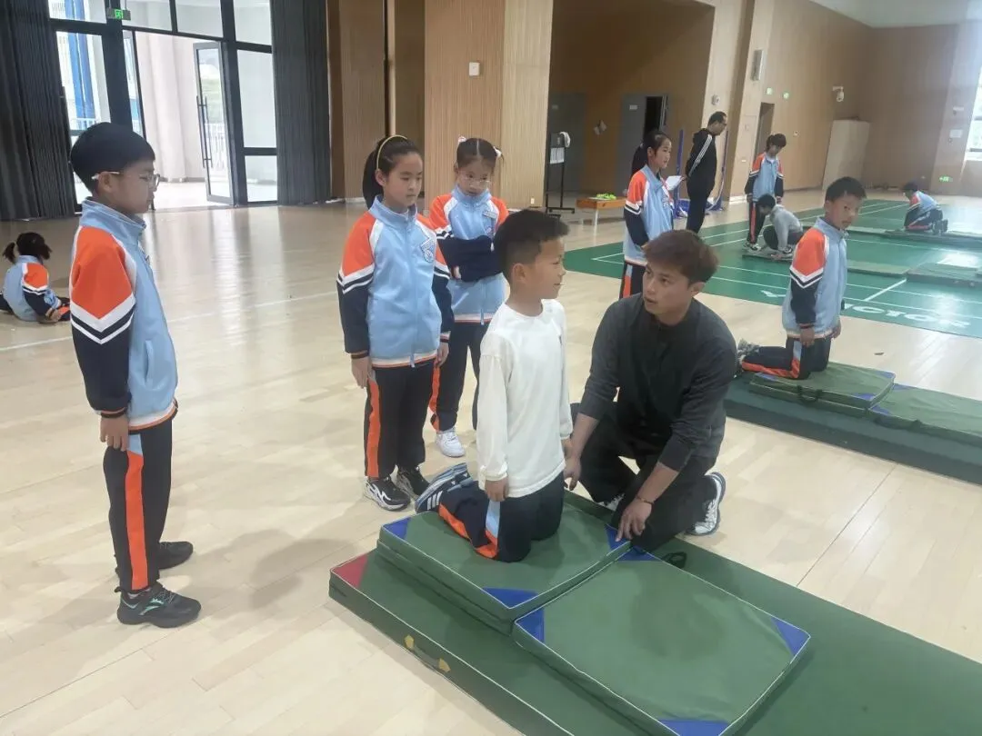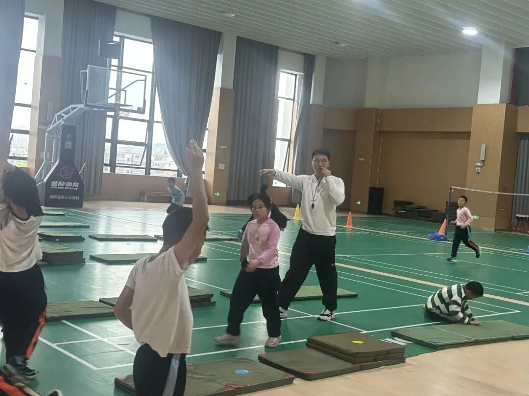 周佳浩:《技巧跪跳起的练习方法》授课活力满满,课堂注重安全指导与趣味练习结合,及时纠正学生动作,充分调动学生运动热情,展现体育教师的阳光与专业。
