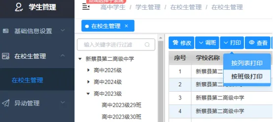 班主任账号进入—-管理端—-学生基础信息管理—-在校生管理—选择班级—打印—按班级打印(全班一次可以下载完毕)。如下图: