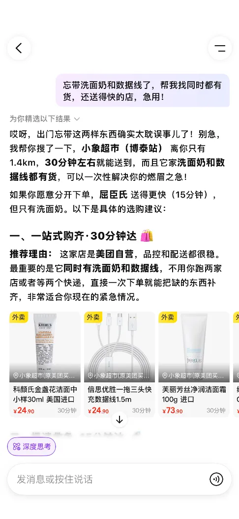 这种便捷的交互体验,也契合了当下复杂的假日消费需求。据美团方面介绍,随着五一出游高峰来临,异地旅游、家庭聚餐等复合型场景增多。同时延续今年春节期间涌现的“生活脚本式”提问趋势,近期用户向“小团”输入完整生活场景求攻略的需求增长迅猛。例如:“忘带洗面奶和数据线了,帮我找同时都有货,还送得快的店,急用!”