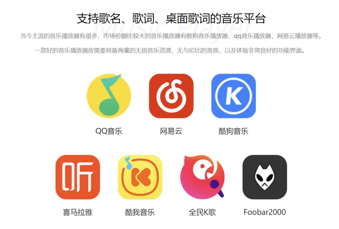 支持常见的播放器,比如网易云音乐、QQ音乐、酷狗音乐、酷我、全民K歌、喜马拉雅、Foobar2000等十几款播放器。