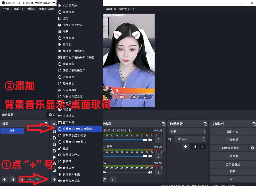 完成登录后,在OBS界面添加【背景音乐显示-桌面歌词】,操作步骤如下图所示