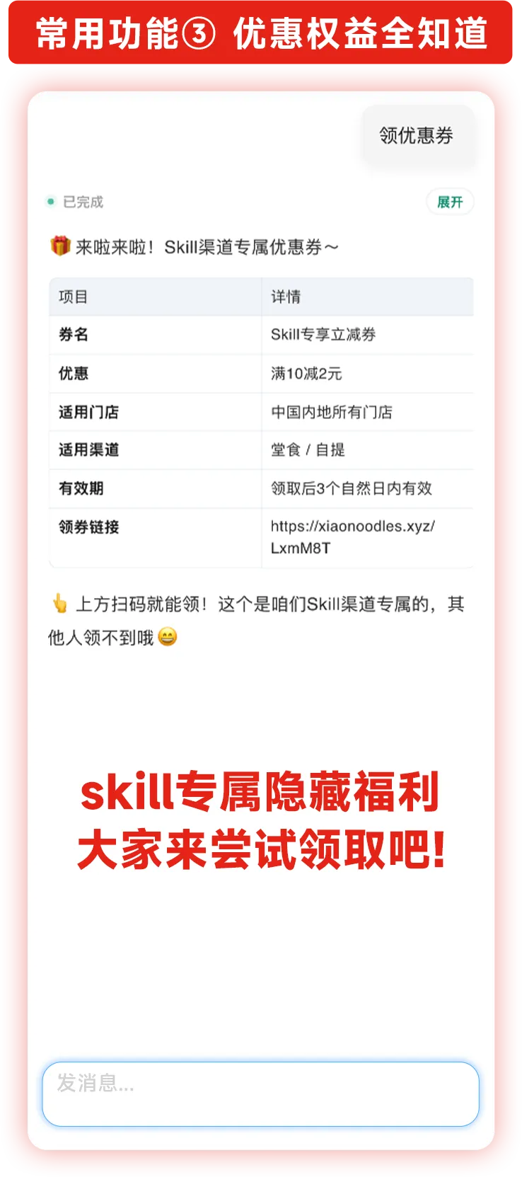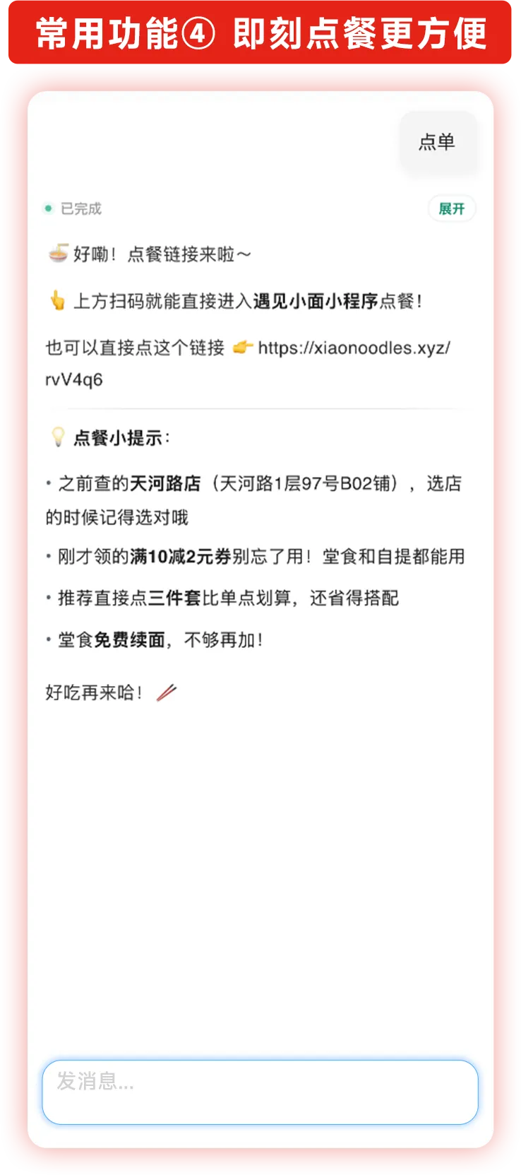 遇见小面.Skill 发布!AI一站式用餐助手! · 帮我安装遇见小面Skill,仓库地址: https://gitee.com/xiaonoodles/xiaonoodles-guide-skill 帮我安装遇见小面 Skill,仓库地址:https://gitee.com/xiaonoodles/xiaonoodles-guide-skill 并启用该skills # 克隆到对应目录 git clone https://github.com/xiaonoodles/xiaonoodles-guide-skill.git ~/.trae/skills/xiaonoodles-guide-skill