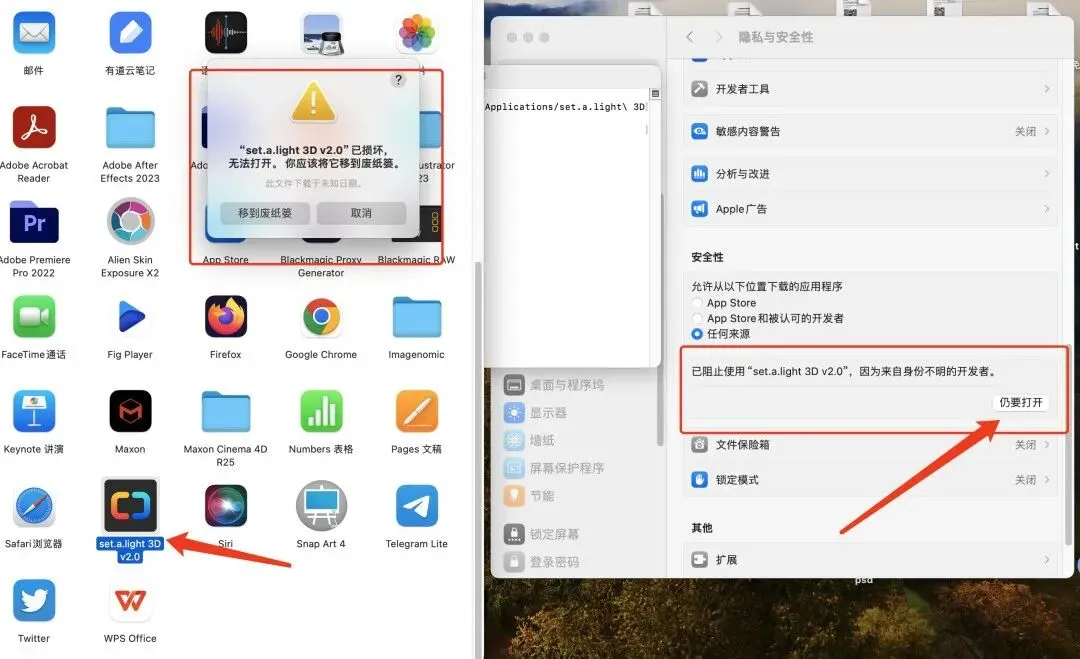 恶意需要开启任何来源或者点击「系统偏好设置 -> 安全性与隐私 -> 通用」中点击始终允许,或者使用代码sudo spctl –master-disable来开启任何来源权限
