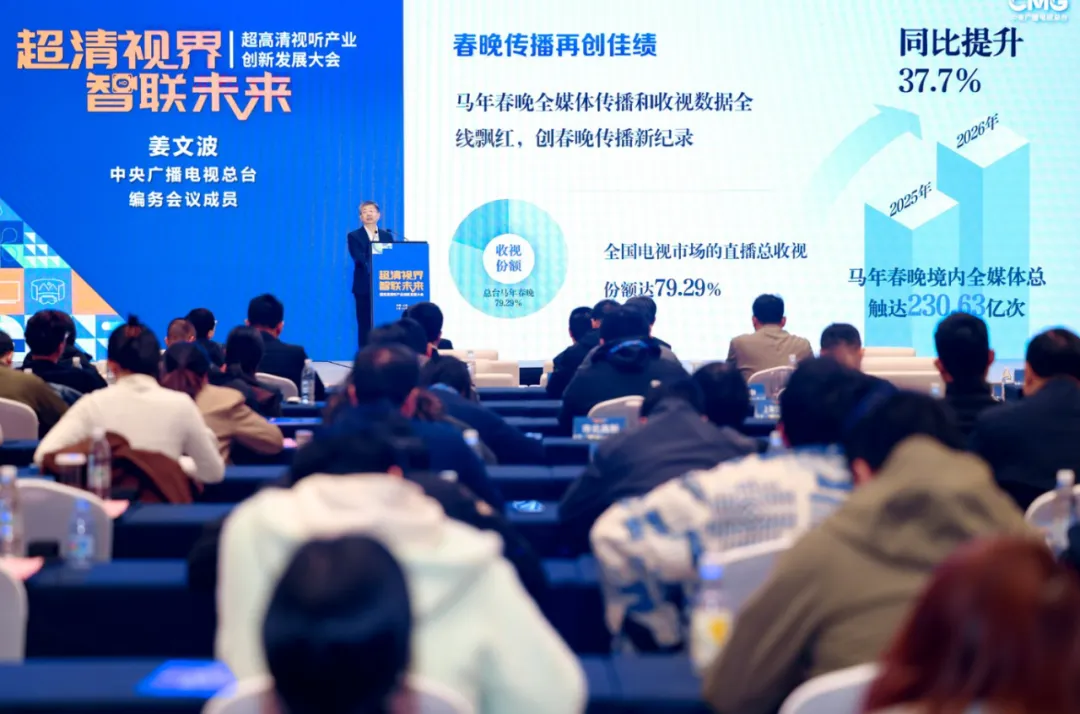 姜文波在会议现场首次揭秘《中央广播电视总台2026春晚科技创新应用》,分享总台作为行业技术先行先试者,在超高清视听内容创制与场景落地的宝贵经验,展现了国家级平台的技术标杆力量。