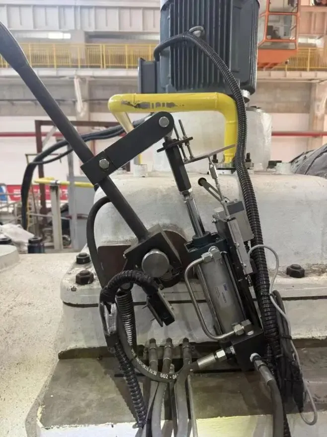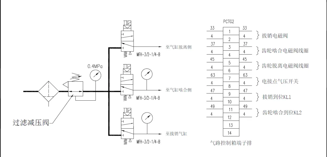 S2齿轮脱离电磁阀:需要检修停机时,齿轮脱离电磁阀 S2 得电工作,压缩空气进入操纵气缸另一侧,操纵气缸推动手柄并配合电机瞬动逆转运行,使小齿轮脱离啮合位置直至插销复位,盘车结束