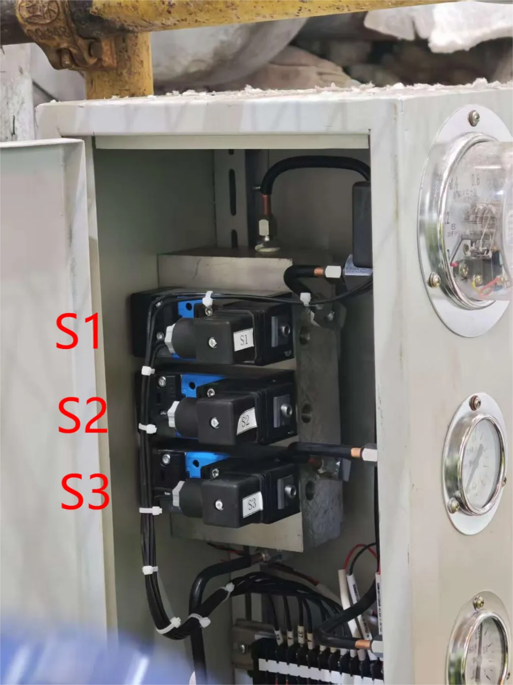 S1齿轮啮合电磁阀:电磁阀 S1得电动作后,压缩空气进入操纵气缸,操纵缸拉动手柄,小齿轮配合盘车电机瞬动向啮合方向运行。盘车正式运行 5 分钟后PLC 切断电磁阀 S1电源,使操纵缸内压缩空气放空,为冲转作准备