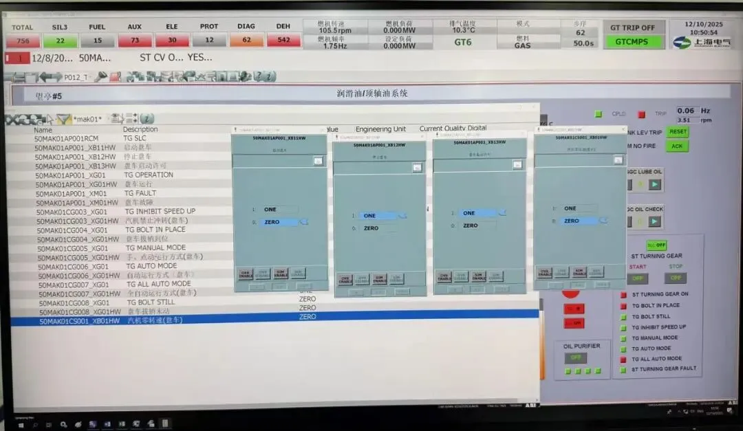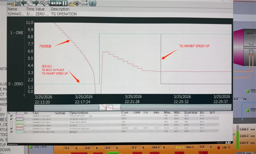 机组停下来时,需投用盘车。随着汽机转速下降到零,发出投用信号。拔销信号和盘车运行信号“0”变“1”,汽机禁止冲转信号来5分钟(5分钟后消失)。盘车故障信号不能来。全自动模式全程投着。