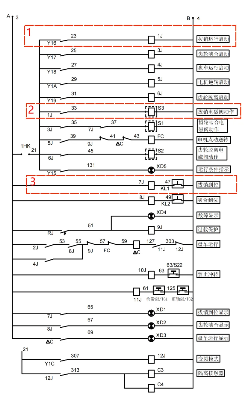 DCS 发出盘车许可命令,回转设备控制装置等待 0 转速信号,如 0 转速开关闭合,0 转速信号输入可编程控制器PLC, 1J 动作,拔销供气电磁阀 S3 得电动作,压缩空气进入拔销气缸,使插销拔出,拔销到位 KL1闭合,7J 动作。